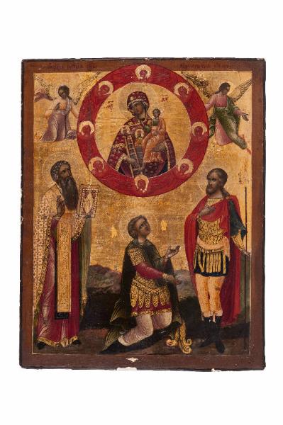 - NOTIZIE STORICO CRITICHE L'icona, di Scuola russa di Palech, risale al primo quarto del XIX secolo. "Scritta" su tavola di tiglio, a tempera all''uovo e lacche su fondo oro, con numerosi particolari in foglia d'oro, raffigura i santi Caralampo, Dimitrij Selounsk e Nikita in venerazione della Madre di Dio del "roveto ardente". I tre santi campeggiano, Caralampo e Nikita in piedi e, fra loro, inginocchiato, Dimitrij Selounsk. Caralampo, vescovo di Magnesia, santo, taumaturgo e martire, raffigurato con un sontuoso sakkos crocesignato (oro su bianco, foderato di verde), omophorion oro su oro, damascato), e imation rosso, regge con la sinistra il Vangelo chiuso e decorato, mentre benedice con la destra, nel segno ortodosso; il suo volto, contornato da lunga barba e lunghi baffi e capelli incanutitti dal tempo e dalle penitenze, è leggermente di profilo con gli occhi girati verso destra e in alto: verso Maria.\nSan Nikita (santo difficilmente identificabile con un personaggio umano, le sue vicende derivano infatti da leggende apocrife che lo vorrebbero persino figlio dell'Imperatore Massimiano. Subì supplizi inenarrabili e sarebbe caduto vittima di Atanarico re dei Visigoti: qui la leggenda si fonde con la realtà di Niceta il Goto, la cui esistenza è attestata: nato a nord del Danubio, perì nel fuoco insieme ad altri cristiani, perché si erano rifiutati di obbedire ad Atanarico e adorare un idolo. Niceta indossa le tradizionali vesti del santo guerriero (corazza dorata, stivali neri alti al ginocchio, cosce nude, manto rosso), colui che scaccia il demonio;poggia la mano destra sul petto, mentre con la sinistra regge una lunga lancia; il volto, contornato da lunghi capelli ricadenti sulle spalle e da corta barba, è ritratto di tre quarti, con lo sguardo alzato verso Maria; al centro, inginocchiato, Dimitrij Selounsk, figura vicina a Michele Arcangelo e a san Giorgio: la sua iconografia lo raffigura infatti in armatura da soldato (corazza dorata, stivali neri, mantello verde e cimiero piumato posato a terra), sebbene le rappresentazioni precedenti al 600 lo vedono vestito di una semplice tunica; dopo la caduta di Costantinopoli esso venne sempre più spesso associato a San Giorgio; rappresentato con le braccia leggermente aperte: la mano sinistra tesa verso l'alto cui è rivolto anche il suo giovane viso (senza barba né baffi; capelli corti e ondulati a caschetto) con atteggiamento di grande devozione: infatti, in alto, è raffigurata la Madre di Dio "del roveto ardente". \nLa Theotokos è dipinta al centro di un tondo medaglione contornato da un orlo di fiamma pieno di cherubini e retto, a destra e a sinistra, da due angeli dalle ali e dalle vesti color pastello, mosse nel volo. Maria, in un cerchio di raggi d'oro, è presentata, di tre quarti, mentre regge il Cristo benedicente, seduto sul suo braccio sinistro; con la destra regge la scala che ricorda il sogno di Giacobbe (Genesi 28, 10-17) e che porta dalla terra al Cielo. La vergine in questa icona, come in vari testi liturgici bizantini, è indicata quale "Pietra non tagliata da mano umana", quale "montagna inviolata"; rappresenta il cielo dove la pietra è caduta e perciò il suo maphorion regale è coperto da cirri e nuvole. Sulla roccia, al centro del suo petto, c'è l'Immagine di Cristo Pontefice e Re, circondata dalle mura della Gerusalemme celeste. Le denominazioni in slavo, in oro su oro, il sacro digramma, in rosso," Madre di Dio", i nimbi, le lacche, il fondo oro, il graffito, la ricchezza della cromia e del simbolismo, rendono l'icona particolarmente suggestiva. È impreziosita da Riza, con recente doratura, in metallo sbalzato, inciso e cesellato. Sul bordo inferiore un'iscrizione a bulino riporta la data 1865.