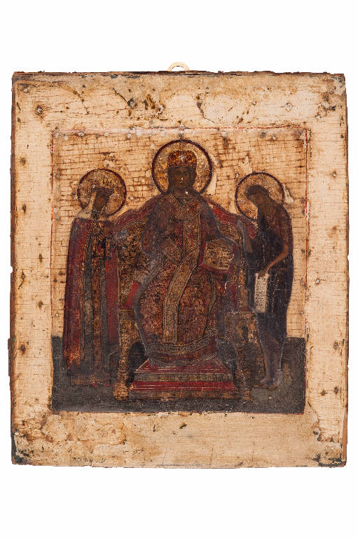 - NOTIZIE STORICO CRITICHE La deesis o deisis è un tema iconografico molto diffuso nel mondo ortodosso: il suo significato è proprio quello della intercessione della divinità. Nella rappresentazione archetipica si vede Cristo in trono tra la Madre e san Giovanni Battista (che hanno permesso rispettivamente l'incarnazione e il battesimo di Cristo), spesso accompagnati dagli Arcangeli Michele e Gabriele e dai santi apostoli Pietro e Paolo. Verso il trono convergono oranti tutte le altre figure in piedi, e lo supplicano di essere misericordioso con l'umanità peccatrice. \nLa nostra icona risale alla metà del secolo XVII. È "scritta", su tavola lignea intera doppiamente incavata di conifera, a lacche e tempera all'uovo su fondo oro. La Madre di Dio e san Giovanni Battista sono raffigurati, in piedi, inclinati, in atto di intercessione, verso la figura centrale: il "Cristo in trono". Il Cristo Pantocratore siede eretto e maestoso su un trono regale, laccato e arabescato; i suoi piedi rivestiti di pianelle rosse poggiano sulla predella a due gradini, laccata di rosso, il colore della sovranità. Cristo campeggia ieratico e splendente, dispensatore di vita ed eterno vincitore della morte: è il Cristo della seconda venuta, il Giudice, che regge aperto, con la mano sinistra, l'unica Legge da seguire, il suo Vangelo, mentre con la destra benedice alla maniera ortodossa. Cristo riveste gli abiti e i simboli da metropolita: tiara, sacchos, omophorion e sticharion, tutti fastosamente ricamati a lacche rosse e oro. Per valorizzare il suo aspetto ieratico il fondo è assolutamente privo di architettura e, mentre il trono, a mecca, attira la nostra attenzione per la ricchezza delle linee, le vesti risaltano per la ricca decorazione floreale. La prospettiva rovesciata sottolinea la discesa del Cristo verso l'umanità. \nA destra del Cristo la Madre di Dio è colei che per tutti noi intercede presso suo Figlio; infatti ha le braccia alzate con le mani aperte in atto di supplica; il suo capo, ricoperto dal maphorion, è rivolto verso Cristo e leggermente inclinato in segno di venerazione, nello stesso atteggiamento del Battista (a sx del Salvatore). \nLa corona sul capo, posata su un bianco e corto velo, e il manto di porpora indicano, da tradizione la sua regalità in quanto Madre di Dio, mentre il blu intenso della tunica ne rammenta l'umanità. Anche Giovanni Battista è accanto a Cristo, perché egli è colui che venne prima di Cristo " per preparare la sua via" (Mt 3, 3). San Giovanni Battista è l'ultimo dei Profeti del Vecchio Testamento, Colui che annuncia la venuta del Messia, il Precursore per antonomasia. Il legame con le profezie bibliche è esplicitamente affermato nei Vangeli di Matteo e Marco, dove si indica ripetutamente in Lui il messaggero che avevano annunciato Malachia e Isaia. Egli ha il volto emaciato e austero e i capelli e la barba incolti, a ciocche, un po' stilizzati, ad indicare il suo carattere di asceta del deserto. Il corpo emaciato e le sua vesti di pelli ci ricordano la sua vita ascetica nel deserto; egli tende la mano destra intercedente verso il Cristo, mentre srotola con la sinistra una pergamena con un passo del Vangelo in cui è citato come "Testimone". Secondo il canone, nimbi, simboli di santità, circondano i volti di Maria, Gesù e Giovanni. La carnagione scura, i capelli e gli occhi scuri, la bocca sempre chiusa rievocano ascesi, preghiera, penitenza, silenzio. Ricco l'Oklad in argento sbalzato e cesellato con applicazioni dei nimbi e di quattro angoli in smalti cloisonné bianchi, azzurri, verdi e rossi dalle varie tonalità . Punzone Kokoshnik di Ivan Lebedkin, ufficiale assaggiatore attivo a Mosca dal 1899 al 1908; punzone della manifattura imperiale con l'aquila bicipite; punzone per esteso firma di P.Ovchinnikov, argentiere attivo a Mosca dal 1853 al 1916; punzone non leggibile del craftsman.