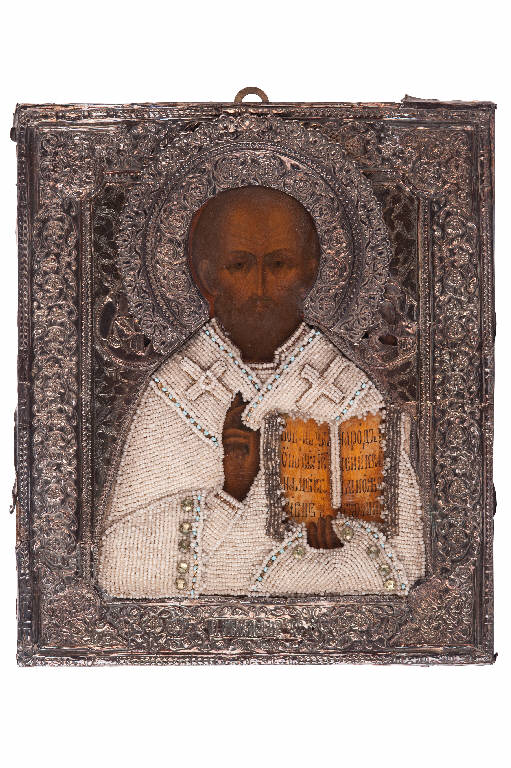 - NOTIZIE STORICO CRITICHE Il culto di San Nicola, protettore ed intercessore nelle disgrazie, patrono dei navigatori e dei viaggiatori, vincitore dei demoni, ha larga diffusione in tutta l'area cristiana sia occidentale che orientale. Le testimonianze dell'universalità del culto di San Nicola sono numerose e costanti. L'autorevole "The Oxford Dictionary of Saints" lo definisce uno dei santi più universalmente venerati sia in Oriente che in Occidente. Anche per l'Enciclopedia Cattolica il Santo di Mira e di Bari è uno dei santi più popolari sia della Chiesa greca che della latina. Un segno palpabile della sua immensa popolarità è dato dalla diffusione del suo nome nel mondo intero, soprattutto se si tiene conto delle sue varianti, nonché dal numero delle chiese a lui dedicate. \nNella nostra icona, di scuola occidentale russa dell'ultimo quarto del XIX secolo, San Nicola vescovo di Mira, è raffigurato, a mezzo busto e in posizione frontale, rivestito da sontuosi paramenti vescovili, su una tavoletta di visciola a tempera grassa e olio; il volto, con alta fronte stempiata, con barba, baffi e capelli castani, è, secondo tradizione, di colorito scuro, ad evidenziare l'ardore di fede che lo "brucia" internamente; anche le profonde rughe sulle gote e sulla fronte e gli occhi, incavati e profondi nella loro fissità, sottolineano l'ieraticità del taumaturgo. Nicola benedice con la mano destra, secondo il gesto trinitario; con la sinistra stringe il Vangelo, che non poggia direttamente sulla mano, ma - in segno di rispetto- sull'omophorion.\nLa riza, in metallo stampato, non è stata rimossa per la fragilità della lamina, per cui non è possibile descrivere gli abiti del santo con la loro cromia. La riza è sbalzata riccamente (cornicette, fascia interne a queste, angoli e nimbo), ad arabeschi che formano, con le loro volute, piccoli grappoli con foglie. Il busto del santo, tranne le mani, è rivestito con perle di vetro bianche, arricchite ai bordi da zirconi e piccole turchesi; le perle ricamano anche l'omophorion con grande croce in rilievo (una a dx e una a sx), sempre di perle. Il Vangelo, aperto alle "Beatitudini", non è coperto, ma i tagli sono riccamente decorati con perline bianche e nere.