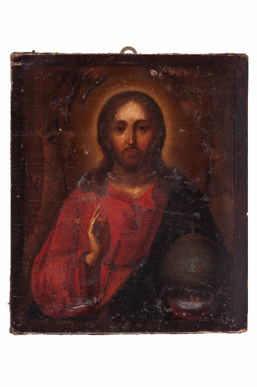 - NOTIZIE STORICO CRITICHE L'immagine del Salvatore del Mondo è quella del Cristo secondo l'iconografia antica: il Salvatore è visto frontalmente, con la figura a mezzo busto. Essa esprime la manifestazione di Cristo vero uomo e vero Dio, creatore di tutto ciò che esiste, insieme al Padre e allo Spirito Santo. La divino-umanità di Cristo è sottolineata da una serie di attributi che si conservano fedelmente nei secoli: il Cristo indossa una veste porpora, simbolo della regalità; la mano destra benedicente (la posizione delle dita ha una suo preciso significato: nel manuale di pittura del Monte Athos leggiamo: "Quando rappresentate la mano che benedice, non congiungete insieme le tre dita, ma congiungete il pollice con il quarto dito in modo che l'indice rimanga dritto e il medio un po' incurvato a formare il nome di Gesù (IC). Il pollice si incroci con il quarto dito e il quinto rimanga un po' curvato a formare il nome di cristo (XC); la sinistra regge un globo crucigero proprio del potere imperiale che riconosce la supremazia di Cristo (rappresentato dalla croce) sul mondo e i suoi poteri terreni (la sfera).\nLa nostra icona, di Scuola moscovita, risale al primo quarto del XIX secolo ed è scritta a olio.\nSecondo la tradizione, Cristo è rivestito di una tunica interna (il chitone di origine romana) rosso intenso e di un manto (imation) blu scuro: i colori rimandano appunto alla divino-umanità del Figlio di Dio: il porpora è il colore della regalità, del fuoco, attributo costante di Dio; il blu del manto simboleggia la sua umanità, assunta nell'Incarnazione; classica la mano destra benedicente e la sinistra sostenente il globo crucigero. \nLa rappresentazione del volto di Cristo, senza nimbo, ma circonfuso di luce, è molto intensa; lo sguardo profondo si impone come sorgente del movimento che anima la struttura apparentemente statica dell'icona. Dal volto ovale, con la carnagione lumeggiata de luce divina, lunghi capelli ricadenti, in due bande, sulle spalle, bocca chiusa, si sprigiona un senso di potenza divina e al contempo di grande umanità. \nL'espressione possiede infatti i caratteri della dolcezza e cordialità tipici della produzione successiva ai secoli XIV e XV, mentre la produzione precedente era caratterizzata da uno sguardo severo, deciso e austero che incute soggezione. Per valorizzare l'aspetto ieratico, come sempre, il fondo è privo di architettura. \nL'icona è rivestita da Riza in argento sbalzato e cesellato, con applicazione di digrammi e iscrizioni su smalto bianco.Il nimbo è applicato a sbalzo con i raggi arricchiti di finti diamanti incastonati. Le sacre lettere (O O N) sono applicate al nimbo in perline di vetro color turchese. Il globo crucigero porta, a cesello, la raffigurazione di una croce greca e di tre cherubini paffuti. Punzoni di Mosca, 1823, di M.K di Michail Michajlovitsch Karpinskij, maestro di saggio attivo a Mosca del 1800 al 1824 e di M·I·T. Michael Timolyeyev, argentiere attivo a Mosca dal 1817 al 1827.