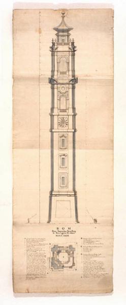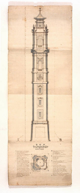 - NOTIZIE STORICO CRITICHE Il disegno raffigura il progetto originario per il campanile e venne elaborato sette anni prima della posa della prima pietra, quando la Fabbriceria era ancora impegnata nella costruzione della collegiata. Sulla base di questo progetto venne stipulato nel 1741 il contratto per la fornitura delle pietre, ma esso venne abbandonato ancora prima che iniziassero i lavori di costruzione. A questo, e al N.I.L. 709, potrebbe riferirsi la nota dell'Inventario 1735-37 "due dissegni grandi fatti per il campanile per Santo Gervasio in Sondrio di molto studio e fatica.