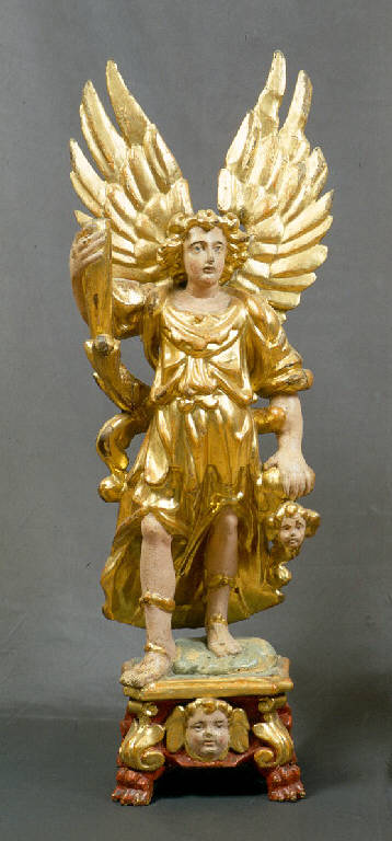 - NOTIZIE STORICO CRITICHE Gli angeli ceroferari sono una tipologia diffusissima in epoca rinascimentale e barocca; la posizioe in piedi è quella che predomina nel Cinquecento e Seicento. La tipologia è molto comune in tutta la Lombardia, specialmente nelle zone montane: si tratta di una produzione quasi sempre locale di intagliatori specializzati che replicavano in serie modelli di origine cinquecentesca, ma con forme più ampie e mosse che tradiscono una cronologia più avanzata, già seicentesca. La statua è interamente ricoperta, salvo gli incarnati, a foglia d'oro stesa a guazzo su bolo rosso. L'intaglio non si mostra molto fine, ma l'effetto d'insieme è garantito dall'espandersi delle figure nello spazio (ampia apertura alare, divaricazione di braccia e gambe), che da risalto alla preziosa superficie dorata, moltiplicando la luce.