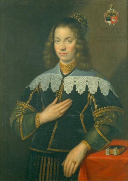 - NOTIZIE STORICO CRITICHE Lucrezia Paravvicini, figlia del Cancelliere di Valle Nicolò, era andata in sposa all'età di 15 anni, a Stefano Perari di Castione e, rimasta vedova si era risposata con il Capitano di Valle Simone Venosta, onde l'unione delle due arme nello stemma. La donna è vestita secondo la moda del tempo: grande cura mostra il pittore nel descrivere il pizzo della bavera i particolari dei gioielli e delle fibbie cesellate che chiudono il libro poggiato sul tavolo in primo piano.