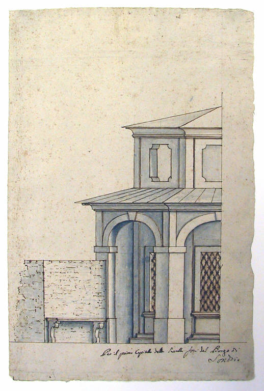 - NOTIZIE STORICO CRITICHE La cappella ancora esistente, venne costruita nel 1713 circa e doveva far parte di una serie di 15 cappelle dedicate ai misteri del Rosario che avrebbero dovuto comporre un sacro percorso lungo la via Valeriana e concludersi alla chiesa della Madonna della Sassella. Tale progetto venne ideato nei primi anni del '700 dall'arciprete di Sondrio G. B. Sertoli e dal fratello Francesco e fu realizzato solo parzialmente con l'erezione di 6 cappelle, di cui quella dell'Annunziata (detta comunemente Madonna della Rocca) fu la prima a essere costruita. La cappella è stata recentemente restaurata. Il disegno rispetto all'edificio realizzato presenta una perfetta identità per quanto riguarda l'impianto generale, mentre se ne discosta, per alcuni particolari, quali le modanature degli archi e la forma delle finestre sopra il portico. La presenza del disegno tra le carte ligariane, in mancanza di dati documentari, non permette un'attribuzione certa del progetto a Pietro. Recentemente M. Ceriana ha ipotizzato che essa possa essere attribuita a G. B. Zotti, il quale nel 1715 eseguì le due statue dell'Annunciazione ad essa destinate.