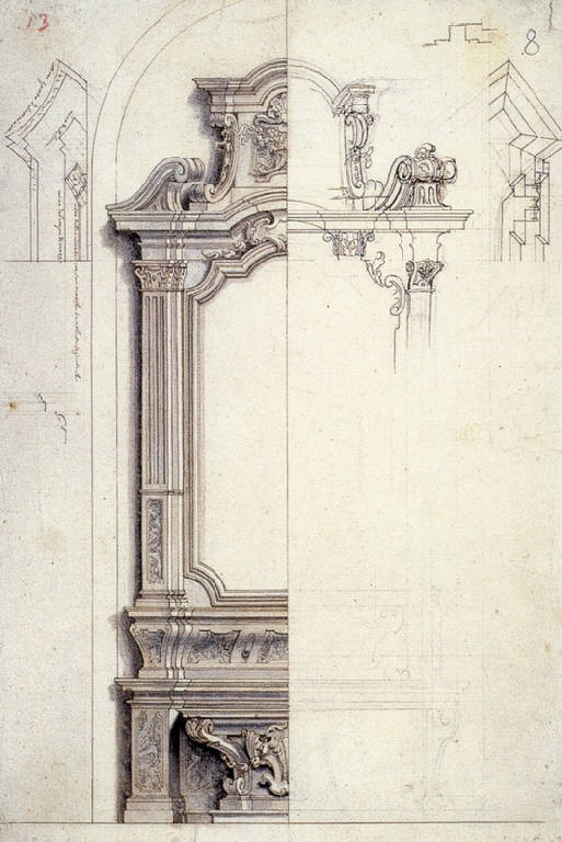 - NOTIZIE STORICO CRITICHE Si tratta di una variante del disegno schedato N.I.L. 22, di cui ripete quasi esattamente la definizione dell'altare di S. Giuseppe. L'altare del Rosario, non completo, presenta della varianti per la definizione della parte superiore. Nel Mastro N (c.81v) Ligari scrive che Carlo Buzzi "ha riceuto il secondo dissegno l'anno 1737 per l'opera ordinatagli per la Cappella del Santissimo Rosario, col quale è unito quello per la cappella di S. Giuseppe", anche se il disegno si trovava nelle mani di Domenico Giuseppe Lavizzari dal 1733. Anche in questo caso i Buzzi ebbero in mano un disegno con le indicazioni di Pietro sui marmi da utilizzare, disegno non conservato, di cui il presente foglio rappresenta evidentemente uno studio preparatorio.