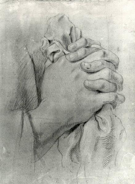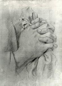 - NOTIZIE STORICO CRITICHE Studio per le mani della Madonna nella tela di Ganda: "La B. V. Addolorata con i Santi M.Maddalena, Domenico e Francesco di Paola, firmato e datato.\nIl foglio è l'unico che si possa attribuire con certezza alla pittrice, e costituisce un importante "test" per definire le note stilistiche che caratterizzano la sua produzione.