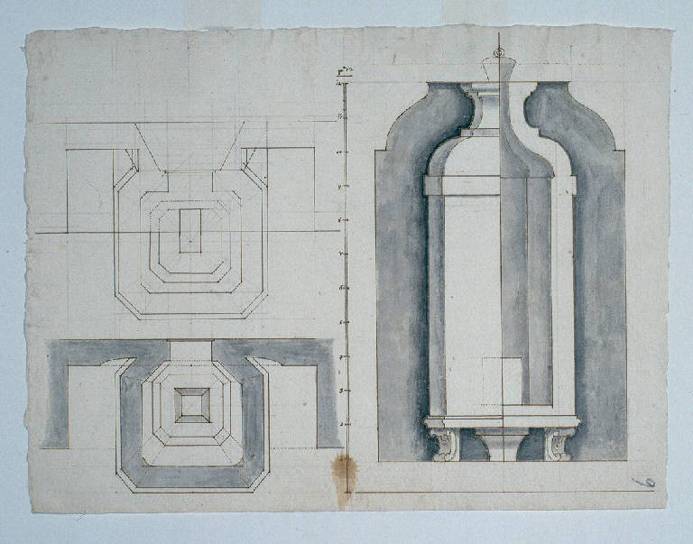 - NOTIZIE STORICO CRITICHE Come specificato dalla scritta del verso si tratta di un "pigna", la tipica stufa valtellinese in muratura, solitamente posta in una stanza foderata in legno detta "stua"; caratteristica della stua è quella di avere la bocca di accensione posta in una stanza attigua. Il Mastro N (c. 67v) menziona il 21 marzo 1733 una "pigna" disegnata per il palazzetto sul Mallero dei Lavizzari di Sondrio. A tale commissione si può riferire il presente disegno, se non alla "pigna" che lo stesso artista disegnò per il proprio studio.