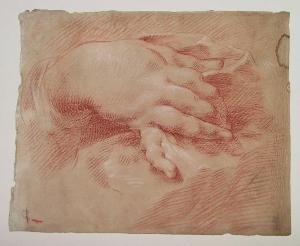 sanguigna, lumeggiature a gessetto su carta beige rosata (recto)