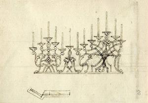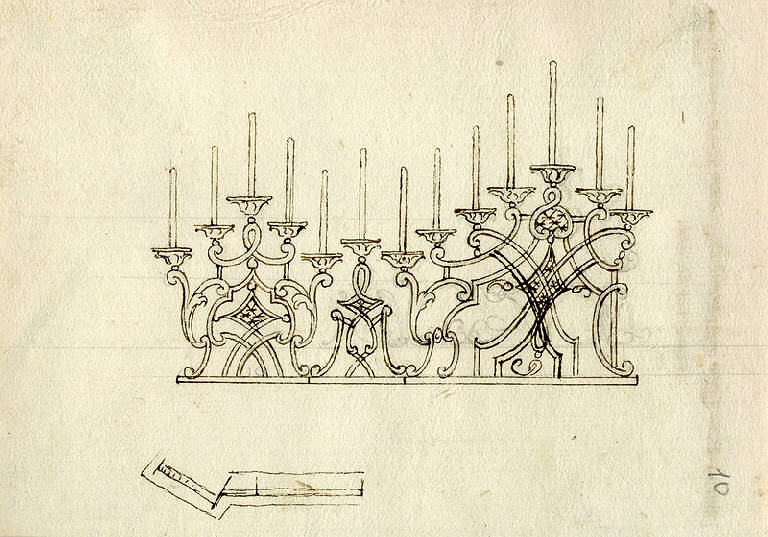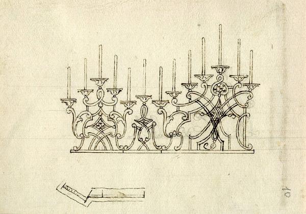 - NOTIZIE STORICO CRITICHE Il disegno del recto sembra riferirsi a quello "ferratina dell'immaculata" da collocare sopra la balaustra della cappella a lei dedicata nella collegiata di Sondrio, disegnata da Pietro negli ultimi anni; di essa si parla spesso nella corrispondenza di Cesare Ligari e del "ferraro" Donato Perlasca di Como. Il disegno potrebbe essere una variante di quello schedato al N.I.L. 16 e datato 1748.\nLo schizzo del verso presenta analogie con le inferriate del disegno schedato al N.I.L. 19.