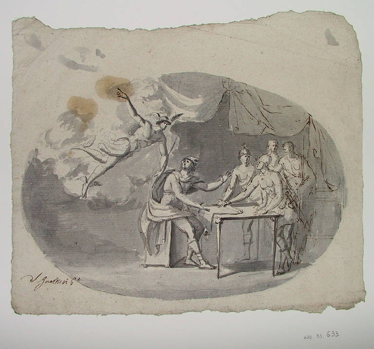 - NOTIZIE STORICO CRITICHE Il disegno rappresenta senza dubbio l'episodio del quarto libro dell'Eneide in cui Mercurio annuncia ad Enea il comando di Giove di partire da Cartagine. Il dio sembra visibile solo dall'eroe.\nQuanto all'autore, si ha notizia dell'esistenza, al principio dell'Ottocento, di un pittore Antonio Gualtieri di Sondrio (Ercole Bassi "La Valtellina ecc.", Milano 1890, ristampa anastatica di Forni, Bologna, 2975, pag, 206; del medesimo autore "La Valtellina, guida turistica illustrata", quinta edizione, Milano 1927-28, pag, 134), ma è dubbio che si tratti della medesima persona, poichè il nome di battesimo sembra cominciare con C.