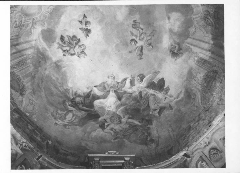 Sul fondo chiaro del catino absidale un Santo, forse S. Benedetto cui si riferisce il miracolo sulla parete sinistra della cappella, viene sostenuto da angeli, con vesti rosate e grigio azzurre. All'attacco della volta corre una balaustra e ai lati è raffigurata una decorazione a riquadri coperta dalle nubi.