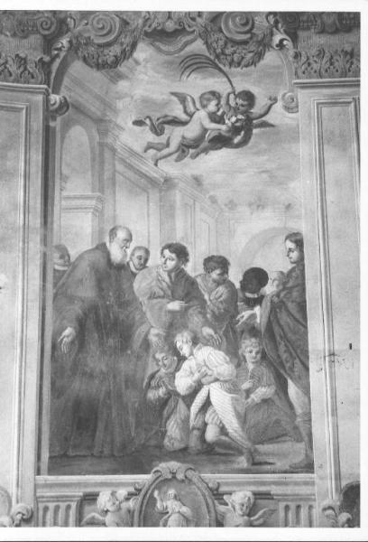 - NOTIZIE STORICO CRITICHE L' identificazione della scena non è sicura. Appare probabile che si tratti di un episodio della vita di S. Benedetto poichè sulla parete di fronte è rappresentata la cacciata del demonio da una pietra. La data, 1710 conservata nell'arcata della campata antistante è senza dubbio valida anche per questo affresco incorniciato da una decorazione a "quadrature" della stessa mano di quelle che decorano la campata e tutta la cappella.