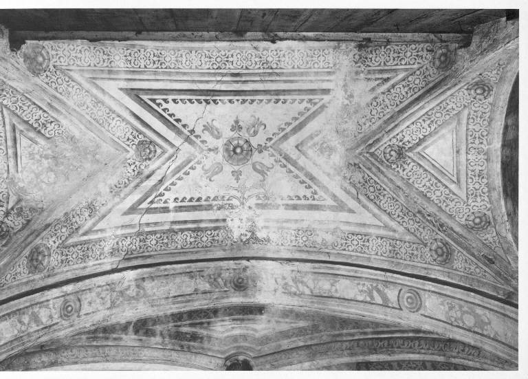 La struttura architettonica della volta è sottolineata dalla partitura della decorazione di tipo geometrizzante e ornamentale su toni di rosa, giallo e verde-grigio.
