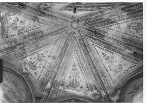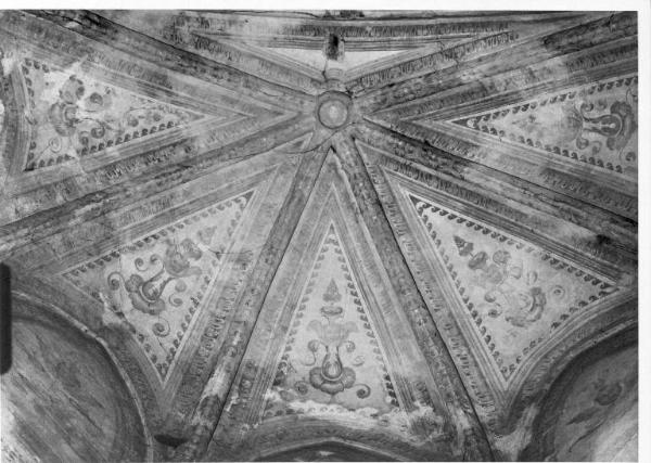 Fasce decorative, floreali e geometriche, corrono sui costoloni o lungo i bordi delle vele; al centro delle vele un motivo "a grottesca" in delicati toni di azzurro, grigio, senape e rosso scuro su fondo bianco. Nelle lunette sono dipinte tesine di angeli. Sulla parete del lato centrale è visibile parte dell'intonaco graffito.