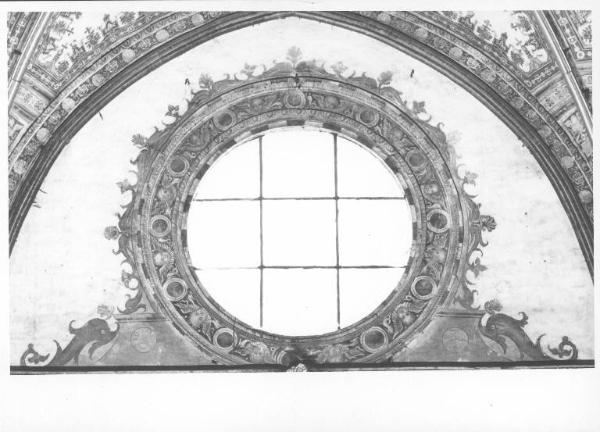 Attorno alla finestra è disposta una fascia bicroma, in bianco e grigio, cui seguono una cornice a fusaruole e una fascia decorata con tondi e testine di angeli alternate, dipinti in toni di grigio e giallo chiaro su fondo scuro. Seguono una cornice a fusaruole in cotto, una fascia bicroma e il fregio esterno a delfini affrontati dipinti in rosso con punte di giallo. In rosso sono dipinti anche i delfini della base.