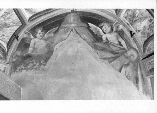 Sotto un'arcata dipinta a finti marmi policromi, due angeli campiti su fondo scuro, reggono una tenda rosa e gialla.