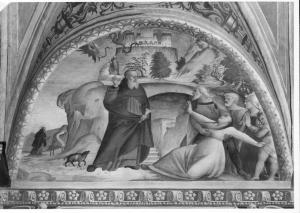 - NOTIZIE STORICO CRITICHE Il Maiocchi citava la decorazione della cappella mentre la Fanciulli Pezzini la attribuiva gli affreschi al Lanzani ed aiuti Nella lunetta, qualitativamente notevole, la mimica contrapposta dei gesti e il moto dei panneggi inciso secondo direttrici di tipo geometrizzante, suggeriscono, nell'ambito della pittura pavese dell'inizio del '500, possibili connessioni con il "Maestro delle Storie di Sant'Agnese in S. Teodoro.