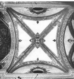 All'attacco delle vele sono dipinti angeli in grigio su fondo rosso scuro; attorno alla chaive di volta sono raffigurate figure di vecchi in monocromo grigio. Le fasce lungo le vele sono decorate con insegne pastorali, libri aperti e il volto di Cristo, in delicati colori su fondo scuro. I quattro busti di monaci, campiti su fondo chiaro delle vele, potrebbero essere un'aggiunta posteriore.