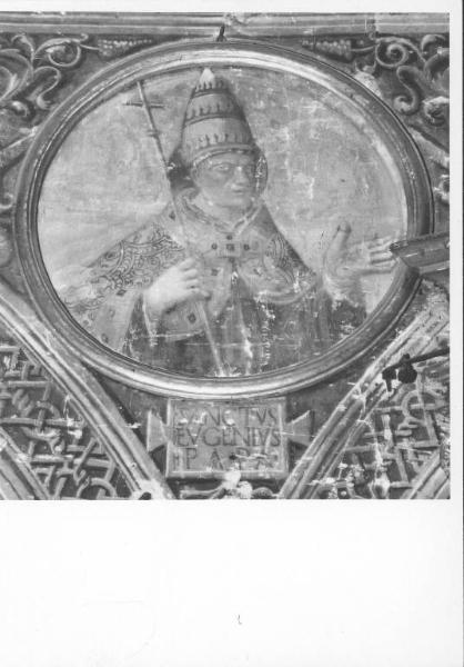 Il papa reca le insegne pastorali e indossa una pianeta gialla su fondo azzurro. Cornice lignea modanata e dorata.