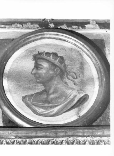 Testa virile di profilo con corona dipinti in monocromo grigio. Cornice lignea dorata.