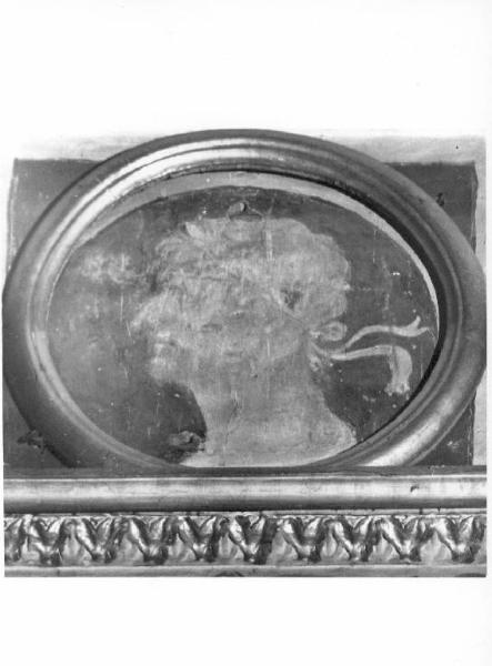 Testa virile di profilo con corona dipinti in monocromo grigio. Cornice lignea dorata.