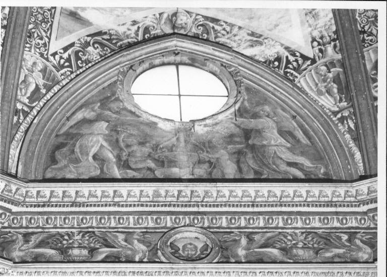 - NOTIZIE STORICO CRITICHE Negli affreschi del tiburio e dell'abside la Fanciulli Pezzini ravvisava echi dello stile del Butinone; essi sono forse meglio riscontrabili, più che in queste lunette, nella volumetria marcata e nitida dei Dottori dell'abside. Una decorazione molto simile a questa presentano la seconda e ottava lunetta. Le cornici lignee e dorate sono settecentesche.