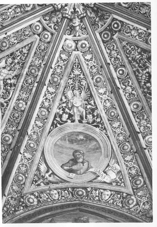 - NOTIZIE STORICO CRITICHE La Fanciulli Pezzini aveva distinto la decorazione della navata centrale, assegnata al Lanzani ed aiuti, da quella del tiburio e dell'abside centrale, definite di "stile butinonesco". La puntigliosa nitidezza del segno della decorazione e le fisionomie marcate dei profeti potrebbero orientare verso il Butinone stesso, anche in considerazione dell'iscrizione della quinta vela con il nome Bernan. Saranno tuttavia necessarie ricerche in questa direzione, poichè potrebbe anche trattarsi di Bernardino Bergognone, pittore attivo in questi anni alla Certosa nella cui formazione possono essere entrate esperienze condotte nella direzione Butinone-Zenale. Analoghe considerazioni possono essere fatte per la decorazione della campata antistante l'abside e per le lunette.\nLa chiave di volta e le cornici lignee dorate che coprono i costoloni sono settecentesche.