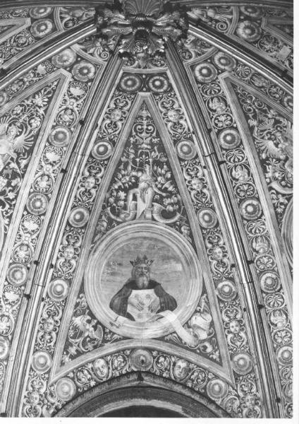 - NOTIZIE STORICO CRITICHE La Fanciulli Pezzini aveva distinto la decorazione della navata centrale, assegnata al Lanzani ed aiuti, da quella del tiburio e dell'abside centrale, definite di "stile butinonesco". La puntigliosa nitidezza del segno della decorazione e le fisionomie marcate dei profeti potrebbero orientare verso il Butinone stesso, anche in considerazione dell'iscrizione della quinta vela con il nome Bernan. Saranno tuttavia necessarie ricerche in questa direzione, poichè potrebbe anche trattarsi di Bernardino Bergognone, pittore attivo in questi anni alla Certosa nella cui formazione possono essere entrate esperienze condotte nella direzione Butinone-Zenale. Analoghe considerazioni possono essere fatte per la decorazione della campata antistante l'abside e per le lunette.\nLa chiave di volta e le cornici lignee dorate che coprono i costoloni sono settecentesche.