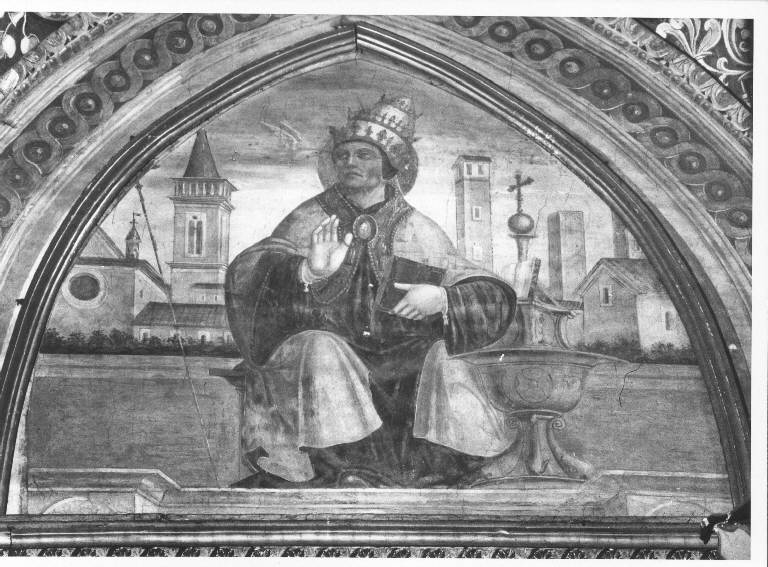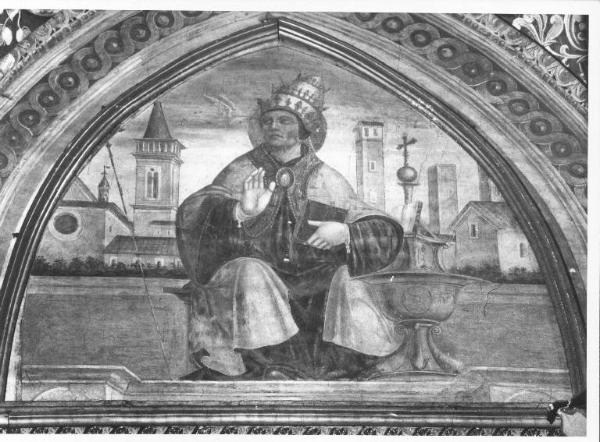 San Gregorio identificabile dalla colomba e dal triregno, indossa un piviale azzurro. Gli edifici sul fondo, probabilmente esemplati su costruzioni realmente esistenti in città, sono dipinti in toni di giallo rosa