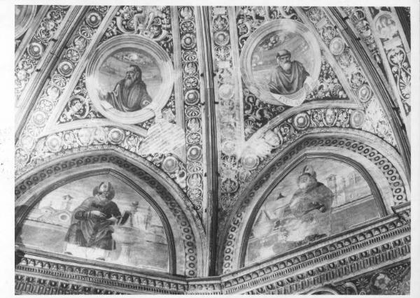 - NOTIZIE STORICO CRITICHE Lo stile "butinonesco" di cui parla la Fanciulli Pezzini (1950, p. 52) a proposito della decorazione dell'abside centrale e tiburio è senza dubbio ravvisabile nelle fisionomie marcate e nella volumetria ampia e sbalzata delle figure dei Dottori. L'ipotesi che si tratti del Butinone stesso potrebbe essere suggerita dalla scritta BERNAN della qunita vela che potrebbe tuttavia riferirsi a Bernardino Bergognone nella cui formazione sono entrate esperienze condotte nella direzione Butinone-Zenale. Cornice lignea dotata settecentesca
