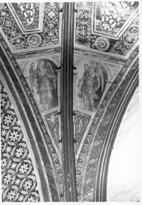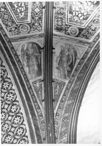 - NOTIZIE STORICO CRITICHE La decorazione presenta forti analogie con quella della campata destra del transetto e della terza campata della navata centrale. La stessa partitura presenta la decorazione delle volte del S. Colombano di Bobbio; negli angeli, particolarmente significativi, dipinti all'attacco della volta, il segno specialmente nitidi sbalza i panneggi con evidenza puntigliosa e rivela esperienze condotte nella direzione del Butinone. Le cornici lignee dorate sono settecentesche.