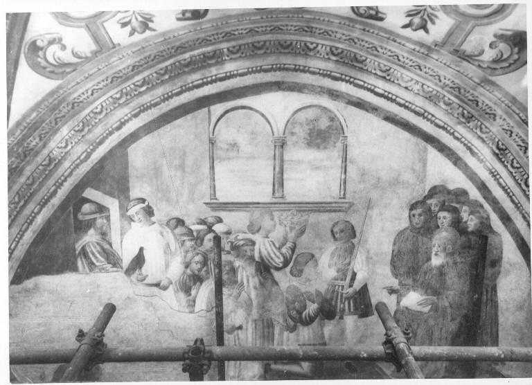 - NOTIZIE STORICO CRITICHE Gli affreschi sono citati dal Maiocchi che li dice "di fattura molto affrettata e di mano poco esperta" e dal Natali. La Ferrari cita gli affreschi assegnandoli a Bernardino Lanzani e aiuti. Il ciclo fu eseguito all'inizio del '500 da un pittore che si formò in ambito locale. L'impostazione schematica dell'intavolatura prospettica, l'andamento rigido dei panneggi articolati secondo linee parallele e il goffo assembramento dei monaci a sinistra attestano un livello qualitativo piuttosto modesto.