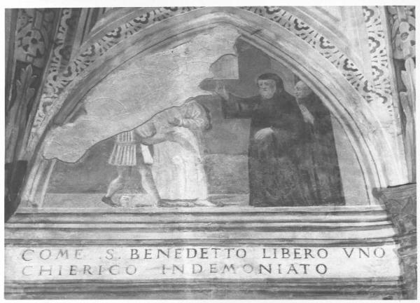 - NOTIZIE STORICO CRITICHE Citano la decorazione della cappella come dedicata a S. Benedetto il Maiocchi, la Ferrari e il Natali. Anche in questa lunetta è ravvisabile la stessa mano delle altre storie della cappella.Sembra plausibile pensare ad un pittore formatosi verso il tardo '400 in ambito lombardo, e forse locale, dotato peraltro di mezzi espressivi assai modesti: si veda in questo caso la tozza riduzione geometrica delle figure dei monaci e del personaggio di centro.