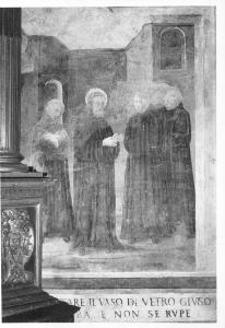 - NOTIZIE STORICO CRITICHE La decorazione della cappella viene citata dal Maiocchi, dalla Ferrari (che la assegna al Lanzani a aiuti) e dal Natali. Essa fu probabilmente eseguita da un pittoredi formazione lombarda, e forse solo locale, attivo all'inizio del tardo '500. Che si tratti di una personalità minore è attestato dalla partitura rigida e schematica del panneggio dei monaci, mancanza di interazione fra figure e sfondo delineato i modo molto sommario.\nDalla iconografia corrente del Santo non si ricava un'indicazione sicura per l'idenitficazione dell'episodio. Nell'episodio del tentativo di avvelenamento dei monaci di Vicovaro, il bicchiere con il veleno veniva rotto miracolosamente.