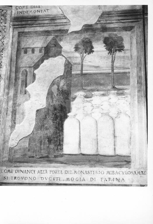 S. Benedetto a sinistra trova sulla porta del monastero, che era rimasto senza provviste, duecento moggi di farina. A sinistra la chiesa è dipinta in toni di rosa, il fondo in toni di giallo e verde.