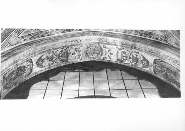Decorazione a grottesche in toni di verde, rosa, giallo e bruno su fondo chiaro; nei due cartigli all'attacco sono dipinte S. Giustina e S. Lucia. In basso nella fascia a meandro gialla e bruna è un piccolo tondo in monocromo verde con figura femminile.