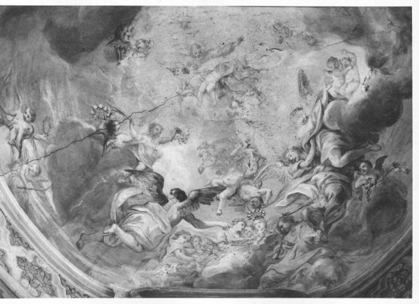 Nel catino absidale è raffigurata una schiera di angeli con strumenti musicali e angioletti recanti corone di fiori e palme in delicati toni di rosa e azzurro su fondo chiaro. Al centro la figura di Dio, non chiaramente leggibile. Anche i capitelli e le lesene delle pareti sono decorati, in toni di grigio e bruno chiaro, con motivi decorativi settecenteschi.