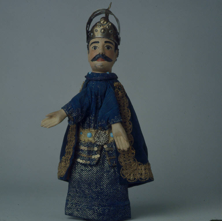 Elmo in ottone, con celata mobile, decorato alla sommità con pennacchio in ottone saldato e, anteriormente, con fregio in ottone con borchie (di ottone anch'esse), inchiodato alla testa in più punti. Sotto l'elmo è inchiodata una parrucca di pelo animale nero, della quale è visibile una parte, molto consunta, che fuoriesce sulla nuca. Testa di legno con baffi scolpiti. Dipintura a olio: incarnato chiaro, guance rosa, capelli dipinti (sotto la parrucca), sopracciglia, ciglia e baffi neri, labbra rosse. Scrostature di colore sul naso e sull'orecchio sinistro, scalfitture sul mento e sulla punta del naso. Occhi di vetro ricavati da spilloni. Gorgiera di stoffa blu, intessuta da fili dorati, decorata con borchiette di vetro turchese e (originariamente) lustrini dorati quasi tutti perduti, inchiodata al collo posteriormente. Mantello di velluto blu, decorato con gallone dorato che lo contorna tutto, foderato di rasatello marrone, fissato con sistema coulisse. (continua in OSS)