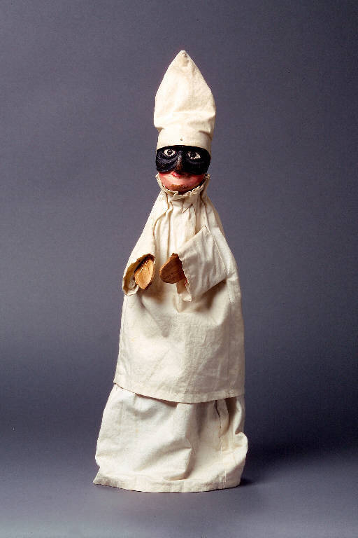 Cappello (coppola) di tela bianca, inchiodato alla testa in quattro punti. Testa di legno dipinta a olio magro, con capelli e maschera intagliati. Incarnato roseo, bocca rossa, maschera e capelli neri, occhi dipinti. Orecchie intagliate. Scrostatura di colore sul mento. Alla base del collo sono praticati fori passanti nei quali scorre un cordoncino che fissa sia il buratto che la veste al collo del burattino. Il vestito è di tela bianca, corto, arricciato intorno al collo e fissato anche con cinque chiodi. Il cordoncino bianco che lo stringe è legato con un nodo posteriormente e cucito poi sul cappello. Buratto di tela bianca come il vestito. Mani di legno compensato, non dipinte, e inchiodate al buratto.
