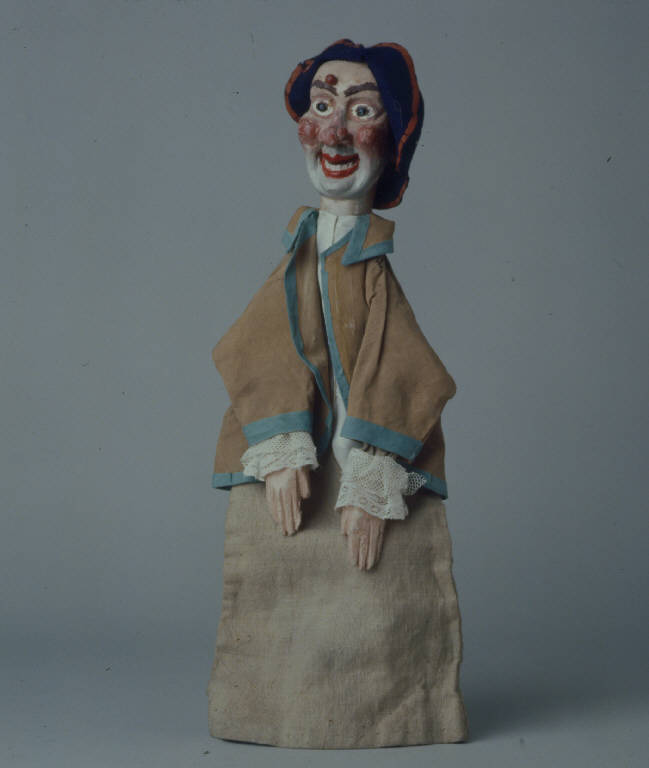 Cappello di panno di lana blu, inchiodato alla testa, bordato con striscia rossa dipinta e decorata con coccarda tricolore stinta. Alla sommità sono infissi due chiodi ai quali è legato uno spago per appendere il burattino. Testa di legno cava, divisa a metà longitudinalmente e riattaccata insieme; probabilmente in origine il naso era mobile e la testa conteneva il meccanismo per farlo muovere. Come accade per gli altri burattini con naso mobile, il collo è allungato con un tubo di metallo. Orecchie scolpite, guance prominenti, due bitorzoli (su sopracciglio sinistro e naso) bocca leggermente aperta, ridente, con fila di denti bianchi scolpita nell'arcata inferiore. Dipintura a olio, verniciata non uniformemente: incarnato roseo con spennellature più scure su orecchie, occhi, naso, gote e bitorzoli, sopracciglia marroni, labbra rosse, ombreggiatura della barba, occhi dipinti con pupilla nera. (continua in OSS)