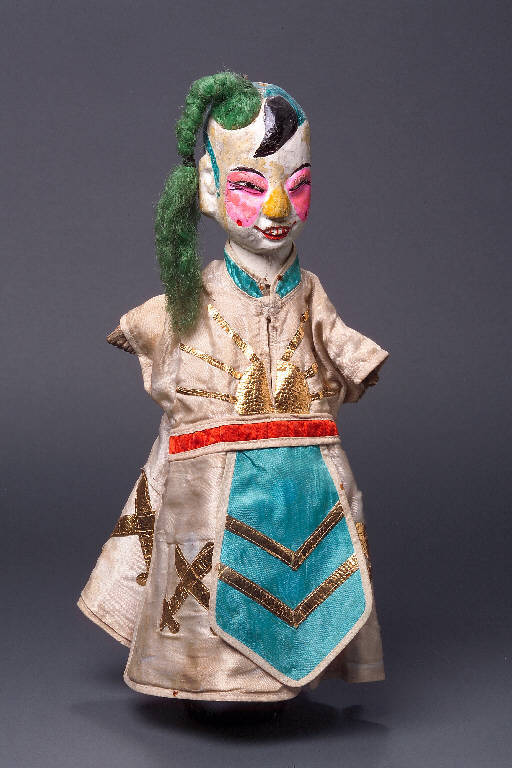 Testa di legno laccato, multicolore: capelli verdi con ciuffo nero in rilievo sulla fronte, incarnato bianco con macchie giallastre, naso giallo, guance e zona intorno agli occhi rosa, con due puntini rossi sulle guance, occhi bianchi e neri, labbra rosse con tre denti segnati in rosso. Treccia di nylon verde che ricade sulla destra, inserita in un foro praticato alla sommità della testa, sopra l'occhio destro. Sempre alla sommità, ma al centro, un altro foro più piccolo che lascia vedere l'interno cavo della testa e, accanto, una cambretta infissa, alla quale è legato lo spago per appendere il burattino. Vestito di raso, foderato di tela bianca, cucito in un punto, sul davanti, aperto inferiormente in quattro falde (con quattro tagli longitudinali, dalla cintura al fondo), bordato all'intorno e ai polsi con fettuccia bianca. (continua in OSS)