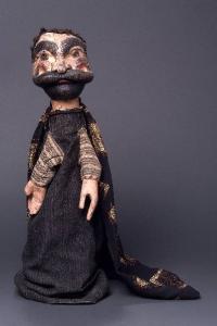 Testa di legno dipinta ad olio: sopracciglia, grossi baffi, barba e guance scolpiti, di colore nero; labbra rosse, guance leggermente rosate. Naso schiacciato con bitorzolo sulla parte destra. Occhi metallici rotondi (forse bottoni), inchiodati al centro. Capelli neri, di finto pelo ricciuto, inchiodati alla testa (più recenti). Il viso presenta scrostature diffuse che gli danno colorazione indefinita e, sulla guancia sinistra, è visibile una precedente coloritura nera. Buchi di tarlo e di chiodi su tutta la superficie. Mantello di tessuto sintetico nero, foderato con rayon nero e decorato con quadrati di laminato oro e marrone, inchiodato al collo in due punti. Buratto di tela pesante stampata a righine longitudinali nere (con braccia in tela a righe bianche e nere, di diversa tonalità), inchiodato al collo. Mani di legno inchiodate al buratto e dipinte ad olio. (continua in OSS)