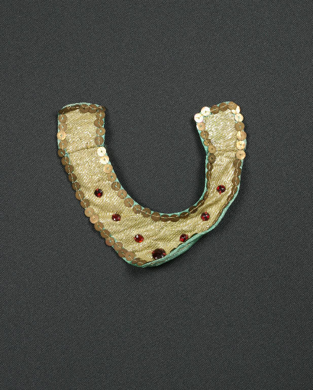 Il collare è di tessuto laminato verde e argento, con fodera di cotone bianca, bordato con nastro di cotone verde e decorato con paillettes metalliche dorate. Sul davanti sono cucite sei piccole pietre e una più grande, tonde, di vetro rosse.