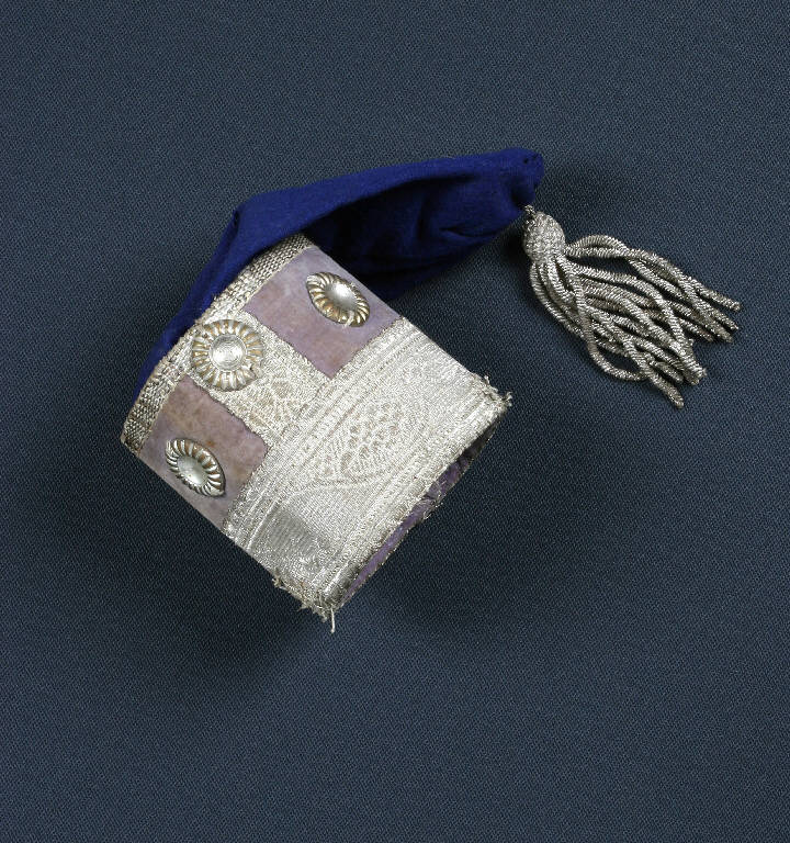 Il cappello, tipo colbacco simile a quelli indossati dagli Ussari, è di cartone rivestito con velluto viola, con cappuccio fissato internamente. All'estremità del cappuccio è fissato un fiocco di passamaneria argento; il colbacco è bordato con passamaneria argento e decorato con borchie metalliche.