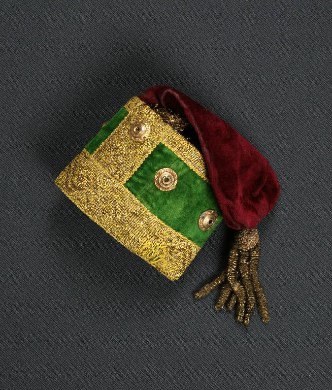 Il cappello, tipo colbacco simile a quelli indossati dagli Ussari, è di cartone rivestito con velluto verde, con cappuccio di velluto rosso fissato internamente. All' estremità del cappuccio è fissato un fiocco di passamaneria oro; il colbacco è bordato con passamaneria oro e decorato con borchie metalliche.