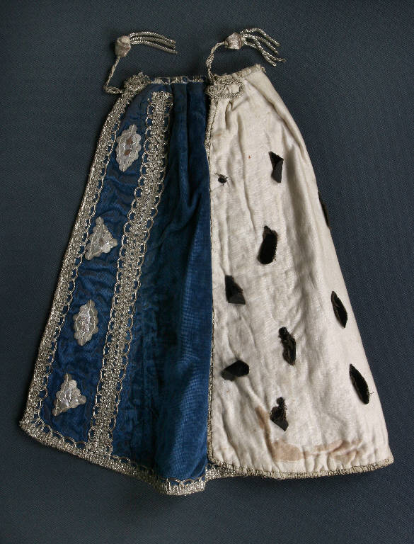 Il mantello è di velluto azzurro con fodera di cotone bianco con piccoli ritagli di velluto nero applicati in modo da simulare l'ermellino. Esternamente bordato e decorato con passamaneria argento, in doppia riga sul davanti, nella quale sono cuciti dei ritagli ovali e triangolari di stagnola argentata fissata su di un supporto di garza e bordati con paillettes argento. E' presente una arricciatura al collo terminante con due fiocchi di passamaneria argento.