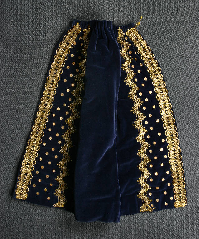 Il mantello è di velluto blu con fodera di tessuto bianco, bordato e decorato con doppia riga di passamaneria oro di diverso disegno, applicata verticalmente sul davanti. Fra le righe sono cucite paillettes oro. E' presente una arricciatura al collo.