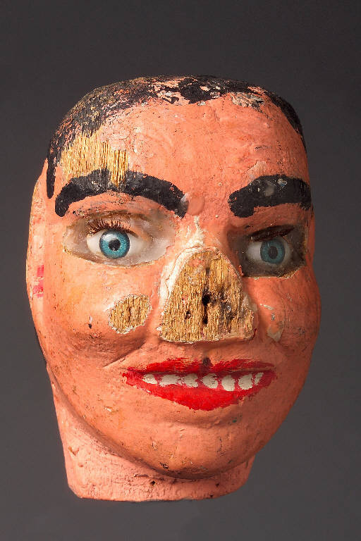 Testa di marionetta successivamente trasformata in burattino.Lo si deduce dal collo troppo corto che non permette di fissare adeguatamente il buratto. Gli occhi in passato scolpiti e dipinti sono stati sostituiti in tempi più recenti in pasta vitrea. Il naso è stato asportato probabilmenmte per applicarne uno più lungo ma il lavoro non è mai stato terminato.