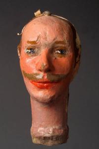 Baffi e occhi dipinti. Interno rinforzato con cilindro in legno per trasformare la testa da burattino a marionetta .Integro non funzionante.