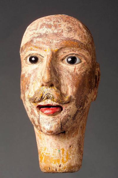 Testa adattata a burattino.Colore originale abraso. Baffi intagliati, bocca mobile, occhi in vetro. Integro non funzionante.